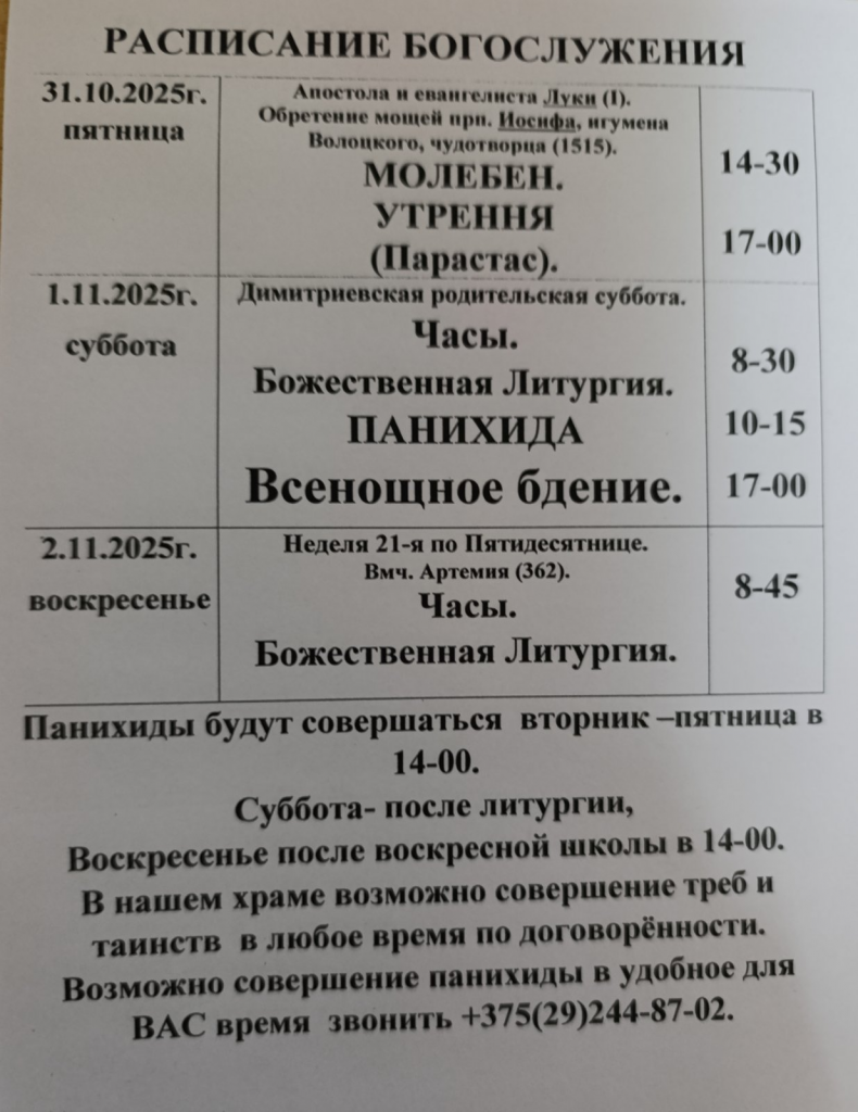 РАСПИСАНИЕ БОГОСЛУЖЕНИЯ