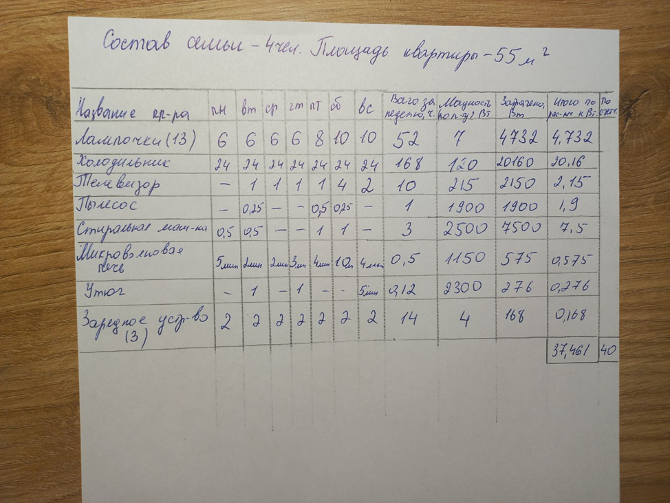 Выполнение задания: составлена таблица с основными приборами, потребляющими электроэнергиюс указанием мощности, времени работы в день и количества потребленной электроэнергии за неделю.
